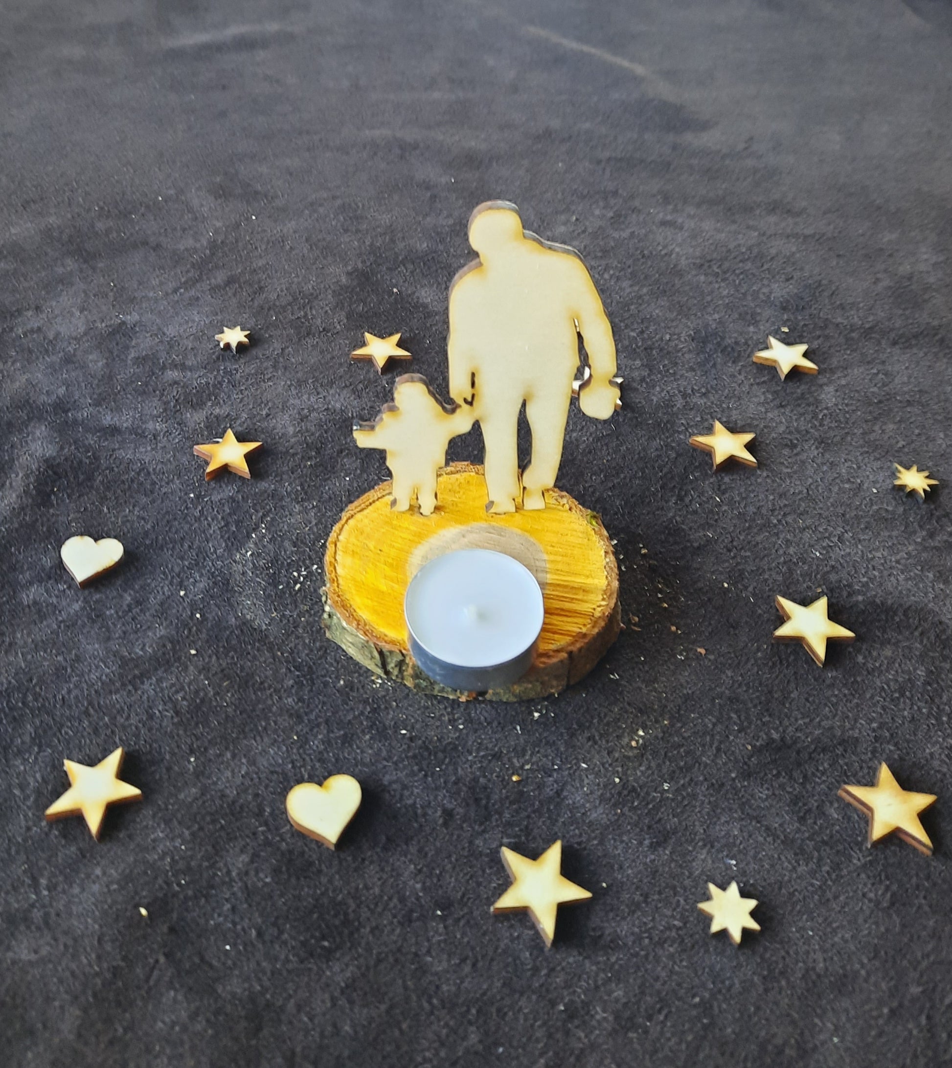 Diese laser-gravierte Holz-Skulptur eines Großvaters mit seinem Enkelkind, wurde aus ca. 4mm dickem Holz gefertigt und steht auf einer Holzscheibe. Die Holzfigur ist ca. 10 cm groß und 15 cm breit. Es ist ein beliebtes Geschenk für Freunde und Familie.
